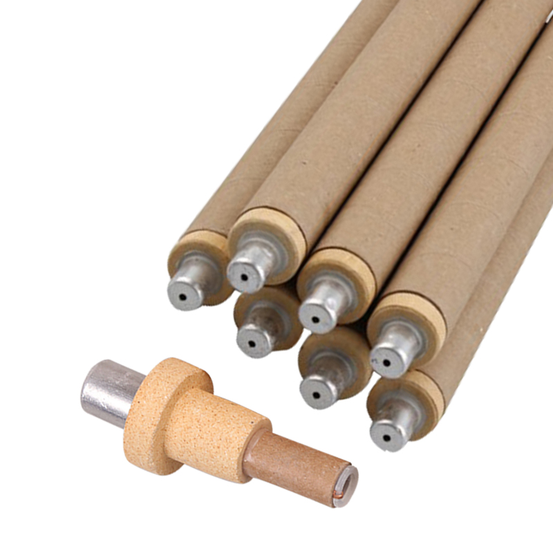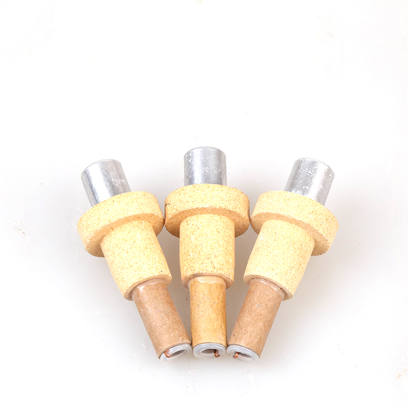 快速熱電偶的工作原理是根據(jù)金屬的熱電效應(yīng),利用熱電偶兩端所產(chǎn)生的溫差電熱測量鋼水及高熔融金屬溫度。速熱電偶的結(jié)構(gòu),它主要由測溫偶頭與大紙管構(gòu)成。偶頭主要有正負(fù)偶絲焊接在補(bǔ)償導(dǎo)線上,補(bǔ)償導(dǎo)線穿嵌在支架上,支架外套有小紙管,偶絲以石英支撐和保護(hù)。*外裝有防渣帽,全部零組件集中裝入泥頭中并以耐火填充劑粘合成一整體,而不可拆卸,故為一次性使用。